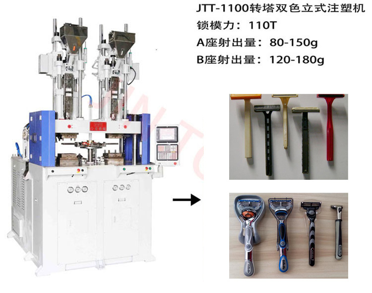 如果覺得雙色轉(zhuǎn)塔機(jī)對(duì)于你來(lái)說(shuō)購(gòu)機(jī)的成本太高了,那么選擇普通的圓盤立式注塑機(jī)也是可以的,比如55T、85T、120T圓盤式立式注塑機(jī)用于注塑刮胡刀把手也可以完成注塑需求。