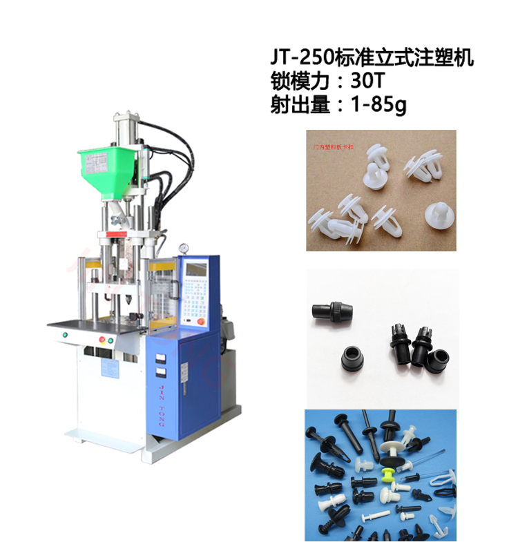 常見的塑料固定扣基本上都是用的PC、PA、PP、PA6等熱塑性塑膠原料,其加熱特點都是差不多的,加熱溶膠的溫度基本上都在180-200度左右,所以選擇標準式的150立式注塑機即可完成注塑要求。